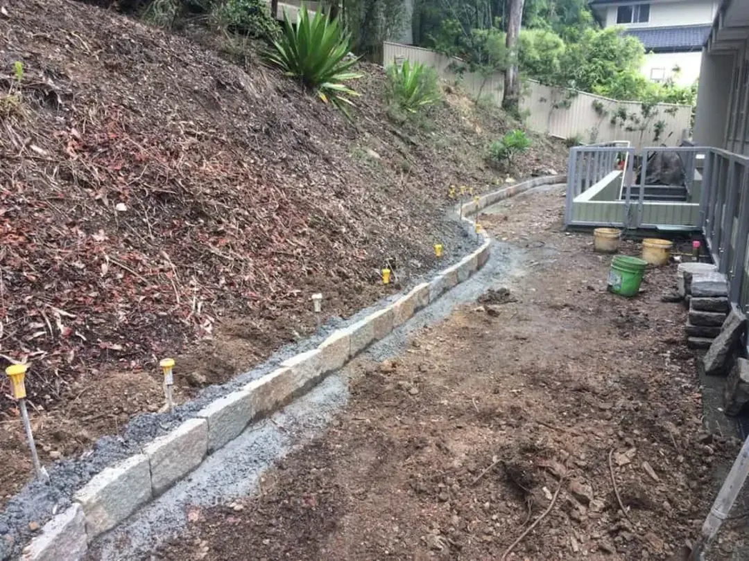 The natural porphyry wall has been built and 60 tonne of top quality soil and mulch has been put along the slope so the garden can be planted out. The garden has a full range of colourful Brisbane plants that require little work to maintain. It has an automatic irrigation system and an automatic LED lighting system.