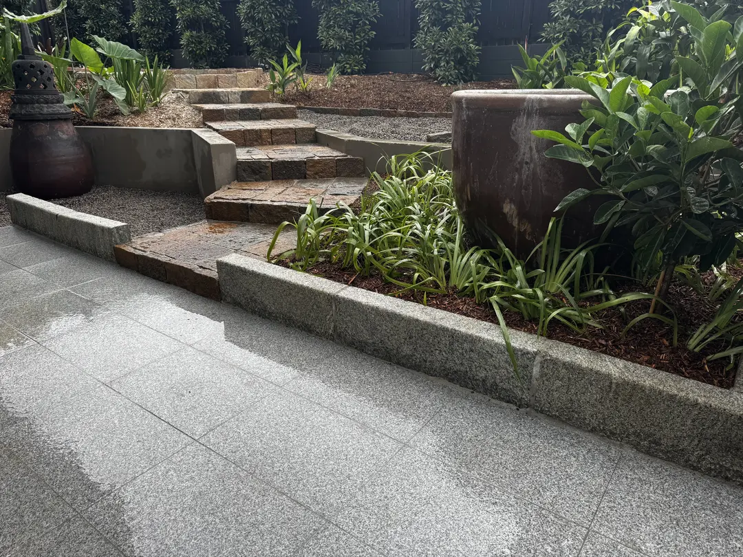 After shot of the natural stone porphyry stairs and garden. I changed the design so it was a very relaxing stair to walk up so the flow rolls around the whole property